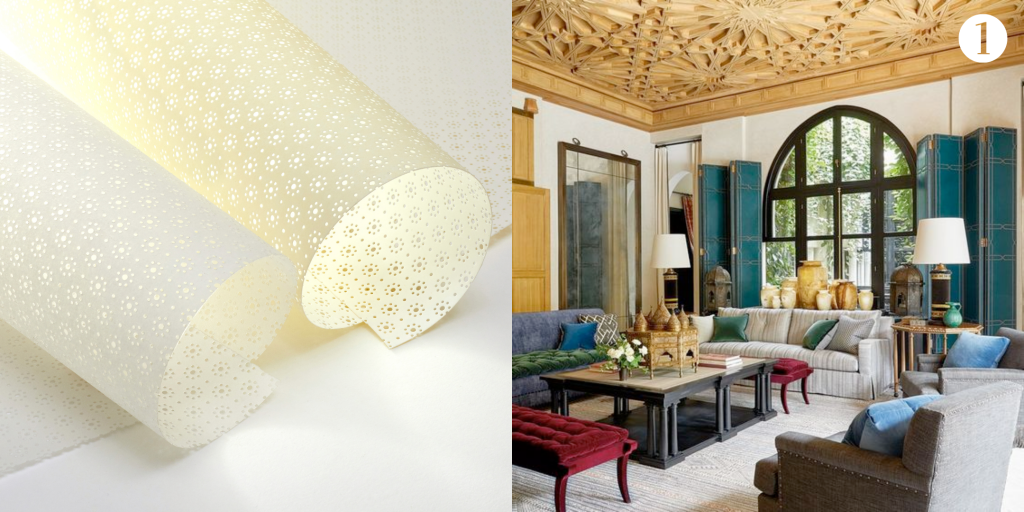 Parfait pour des Ambiances romantiques ou d’inspiration arabesque. Dans l’image, nous présentons le design Daisy sur deux matières de GPC Mares: le Pergamino blanc, plus transparent, et notre Montblanc cru avec plus de contraste.